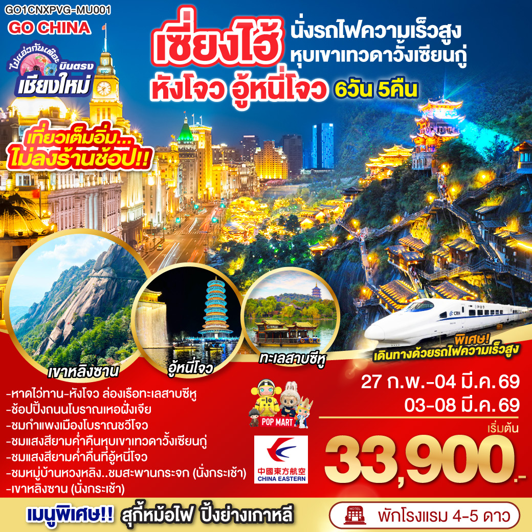 | 5 | เขาหลิงซาน(รวมกระเช้าขึ้นลง) –เซี่ยงไฮ้ (นั่งรถไฟความเร็วสูง) – หาดไว่ทาน | ✔ | ✔ | ✔ | WYNDHAM SHANGHAI PUDONG HOTEL หรือเทียบเท่า 4 ดาว |