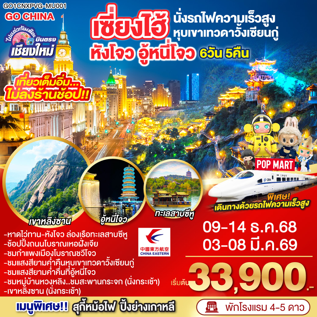 | 5 | เขาหลิงซาน(รวมกระเช้าขึ้นลง) –เซี่ยงไฮ้ (นั่งรถไฟความเร็วสูง) – หาดไว่ทาน | ✔ | ✔ | ✔ | WYNDHAM SHANGHAI PUDONG HOTEL หรือเทียบเท่า 4 ดาว |
